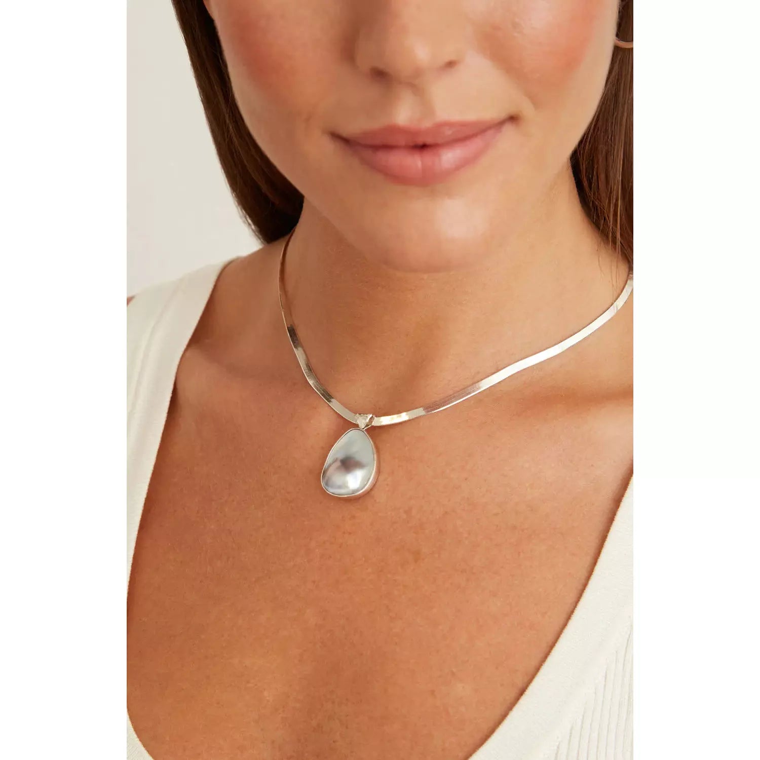 The sleek silver herringbone chain boasts a grey blister pearl totem pendant in this bold necklace designed for everyday wear.