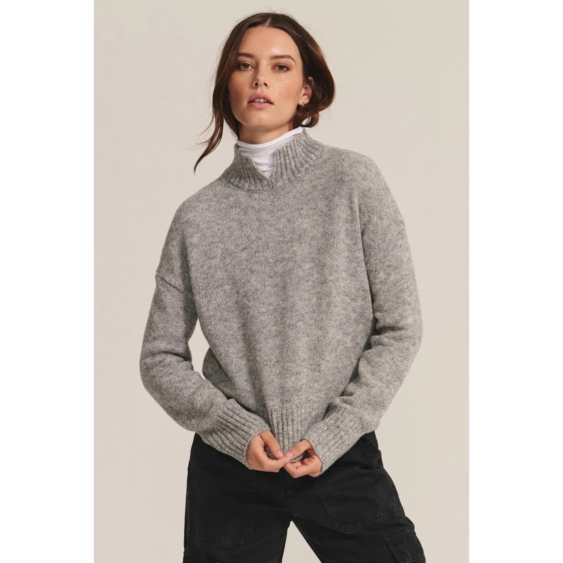 Crafted from a soft wool blend, this slightly cropped sweater features a fold-over collar, wide ribbed trims, and heathered coloring for rich texture and depth. Style it with a white mock neck or layer a simple tee underneath for added warmth and an effortless layered look.